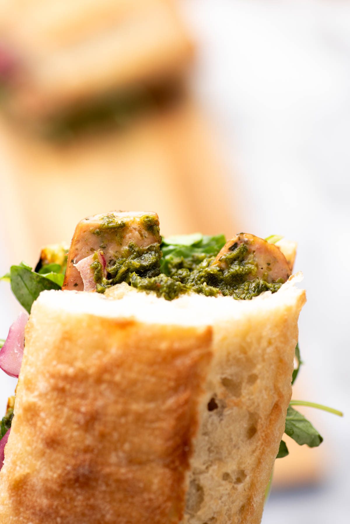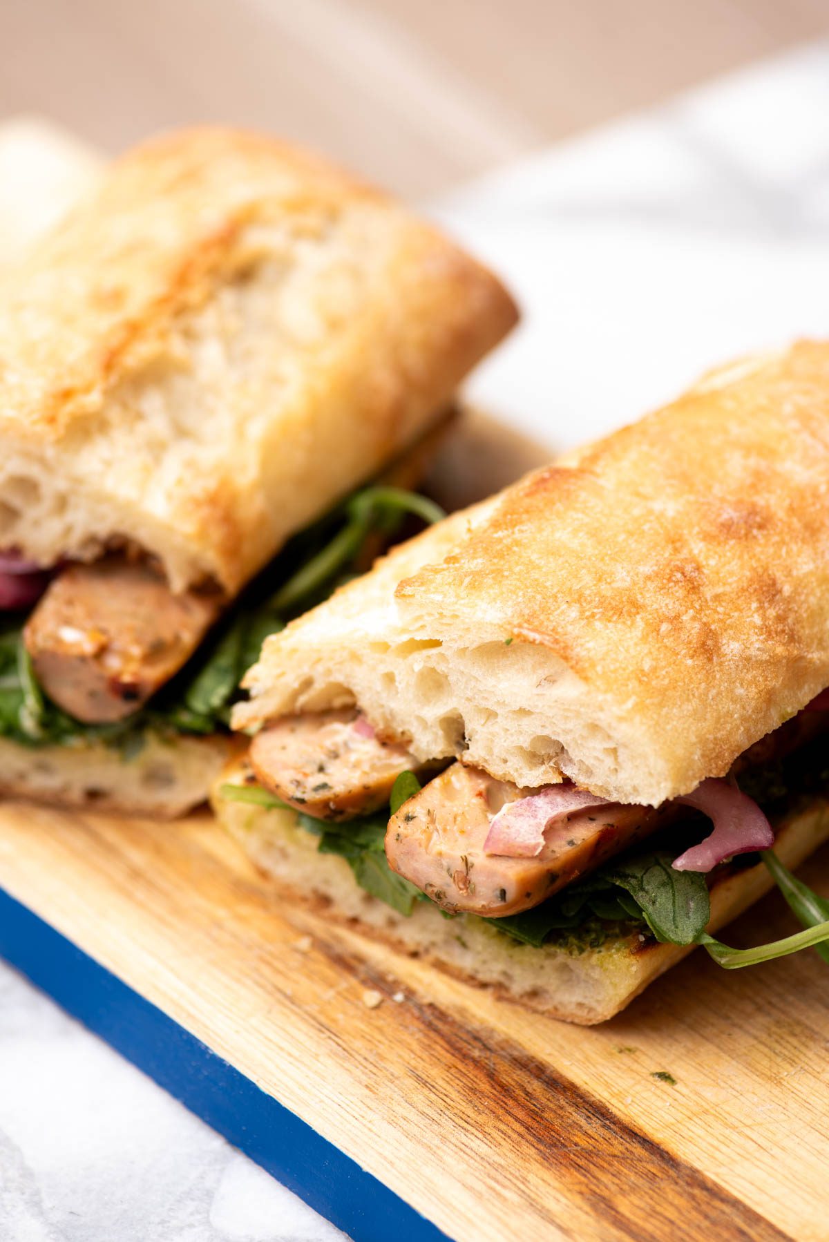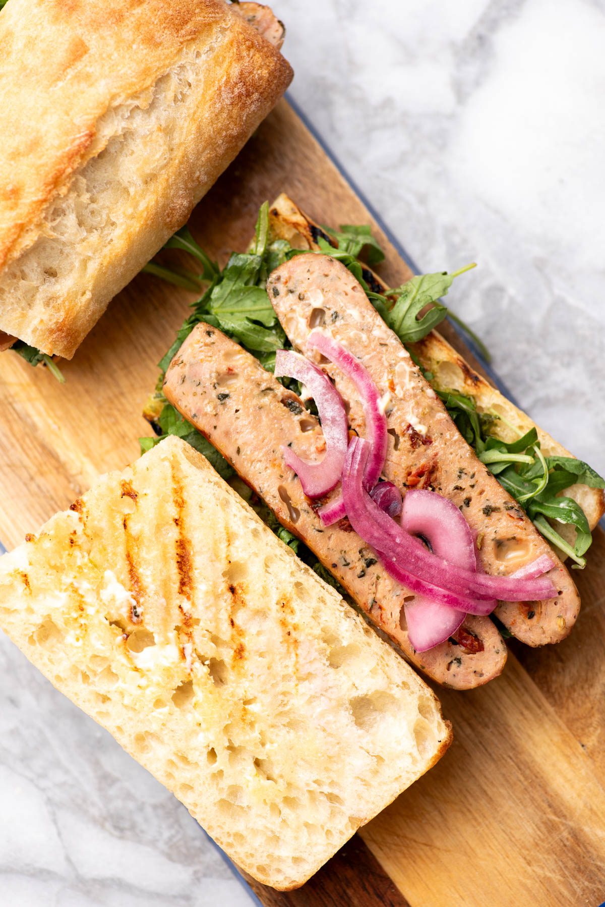 This sandwich is the perfect mashup between a hotdog and sub. The sausage gets grilled to perfection and instead of using a hotdog bun, it's tucked in a crusty piece of bread like ciabatta.