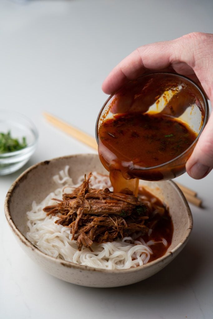 When ready to serve your meal, place the bed of noodles in a bowl, top it with the shredded beef and add the consomé. Garnish with plenty of cilantro and onion.