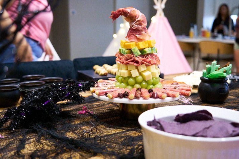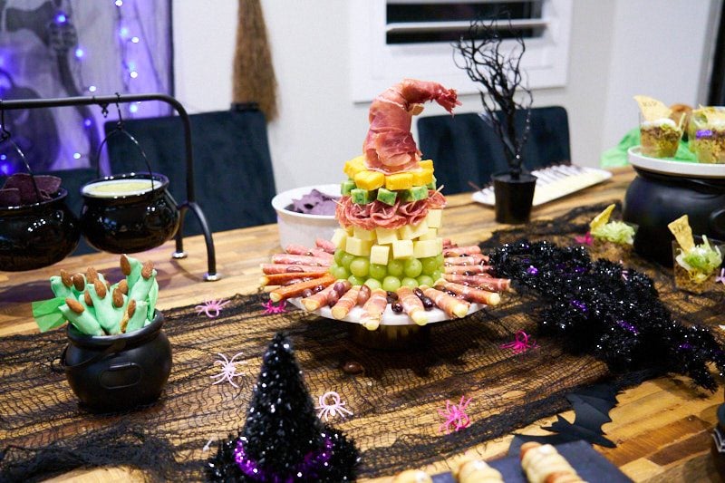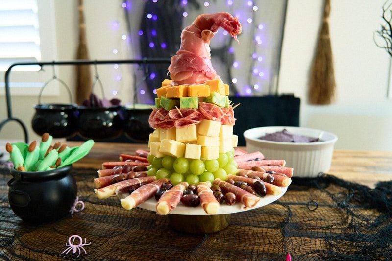 This Halloween Charcuterie Board is the perfect centerpiece for your table. Shaped like a witch's hat, this board is spooky and cute.