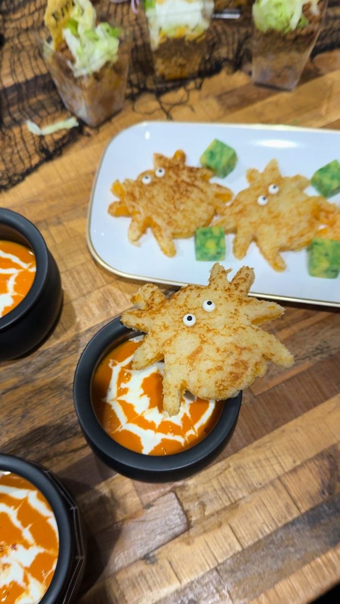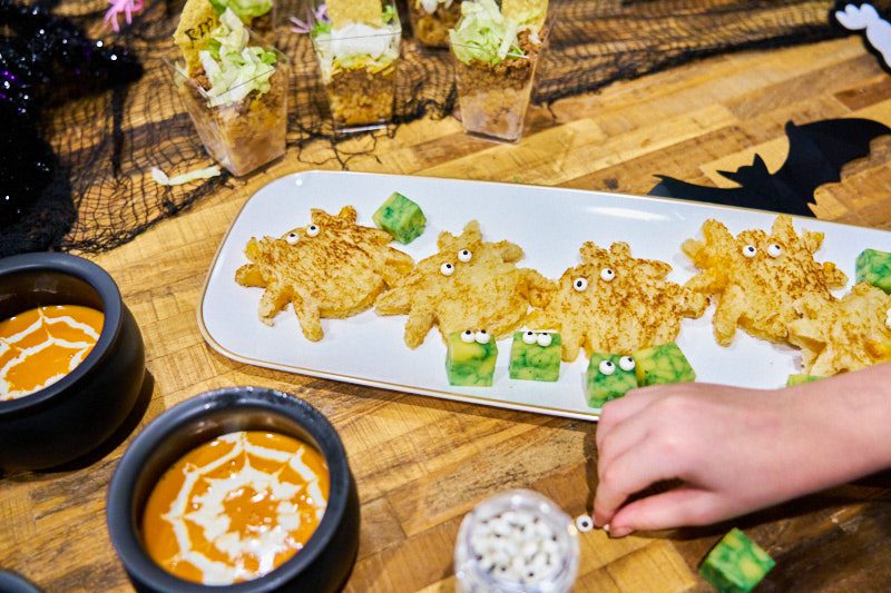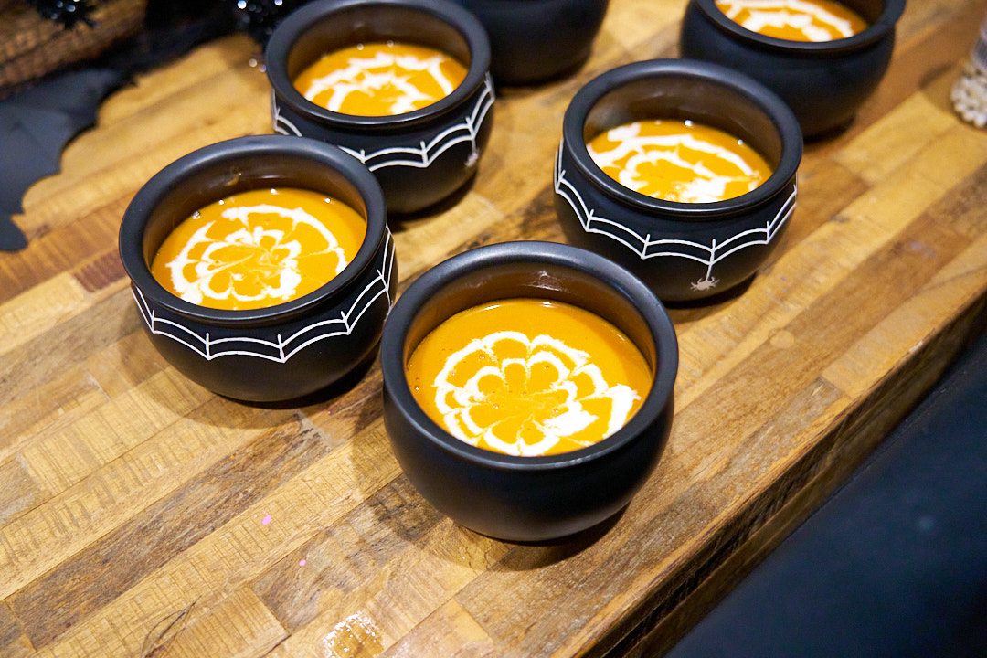 I served the tomato soup on a ceramic cauldron for a more spooky look. A set of black bowls will also work well here.
