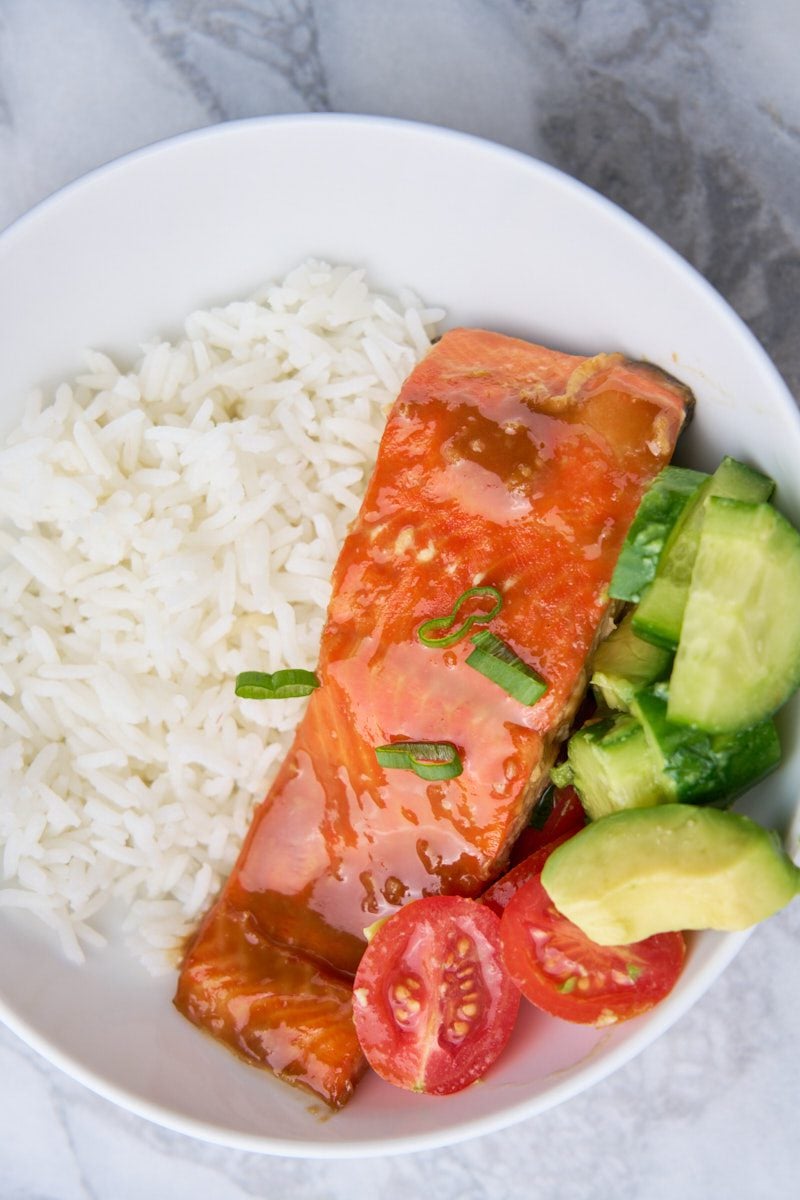 This maple balsamic glazed salmon is great over rice or roasted potatoes.