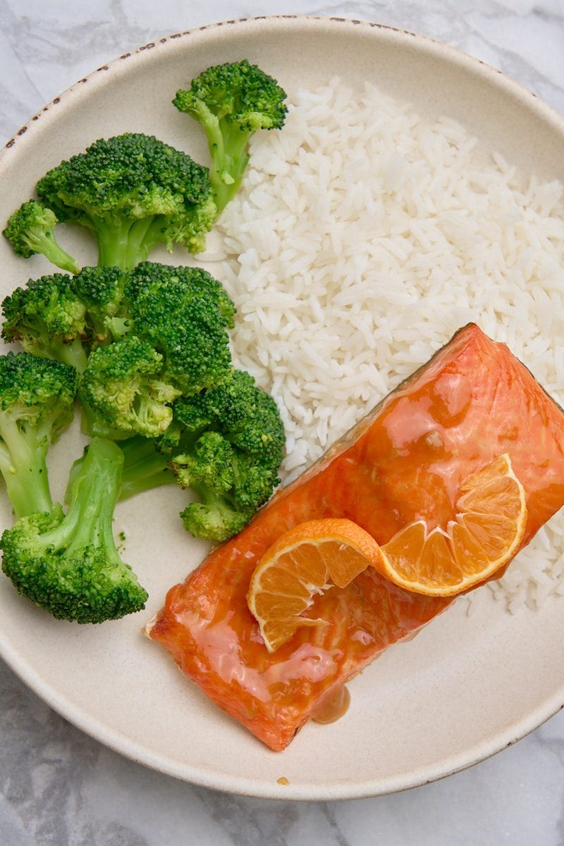 Serve the salmon with rice and broccoli for a filling and delicious meal.