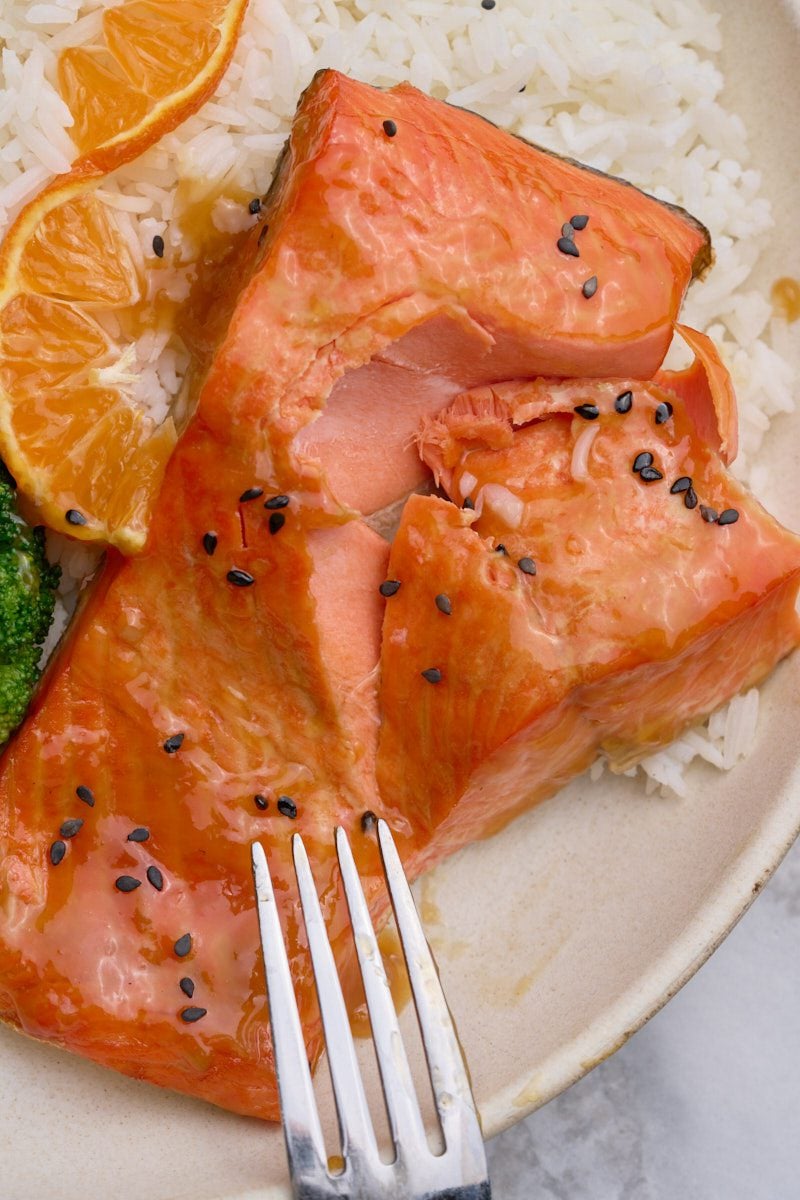 This orange glazed salmon is a perfect weeknight dinner that pairs tender and flaky salmon with a zesty orange sauce.