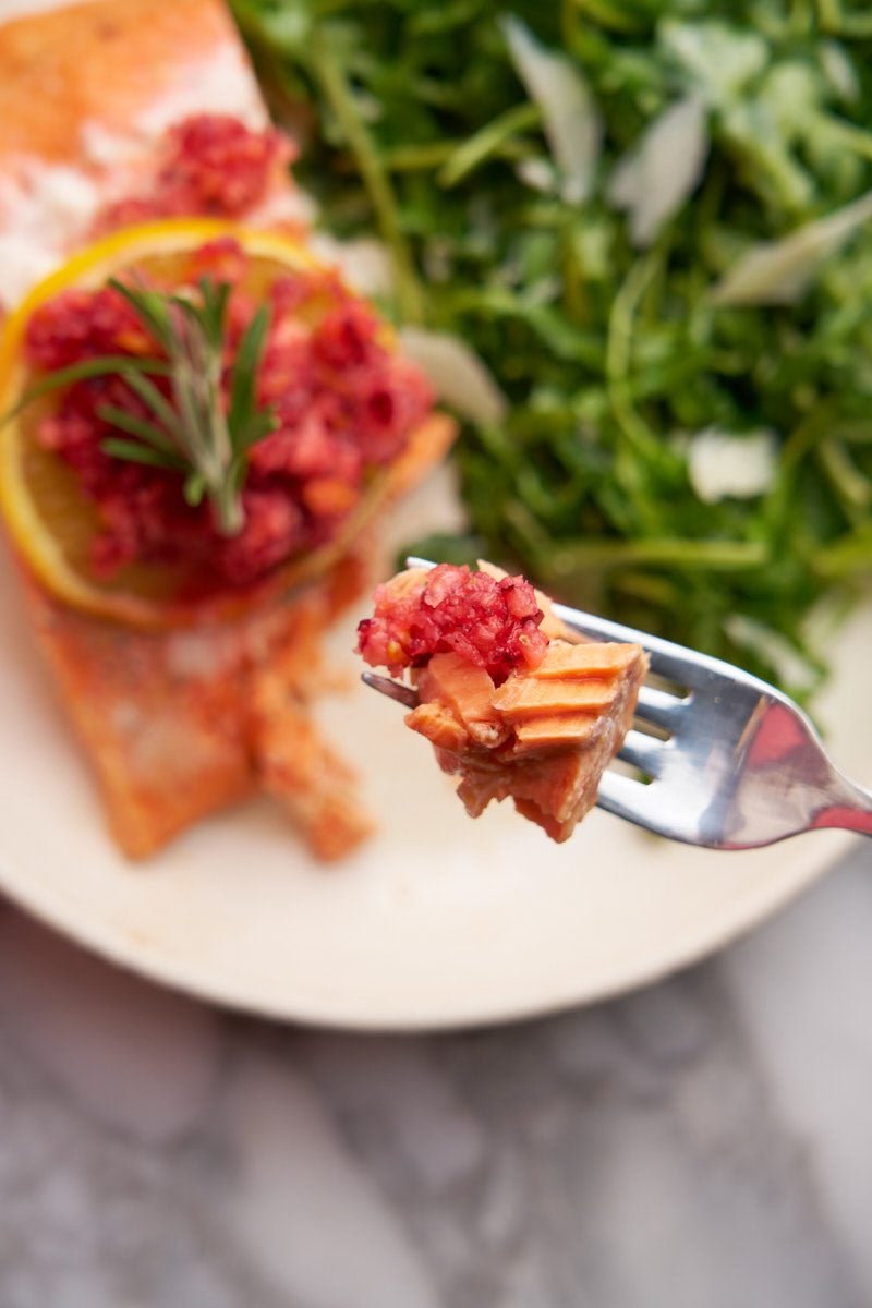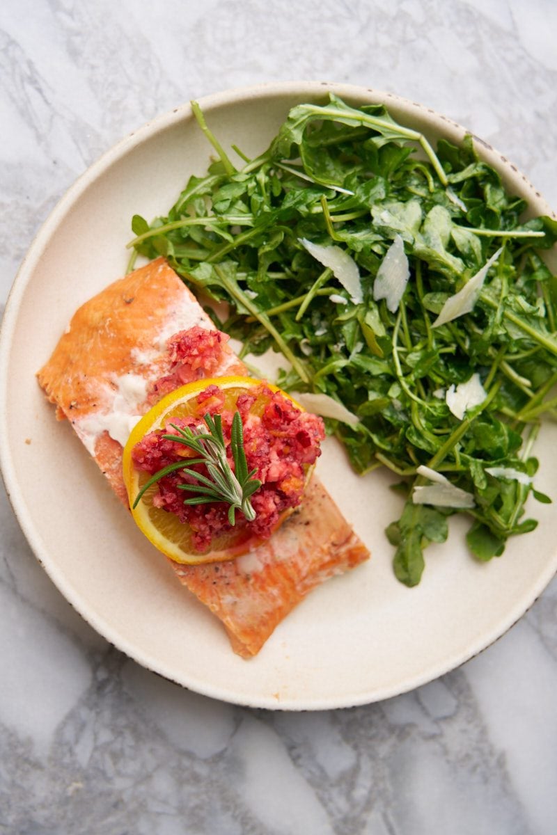 When the salmon is done baking, top with the cranberry relish and garnish with rosemary. Serve with arugula salad or your favorite green salad and enjoy.