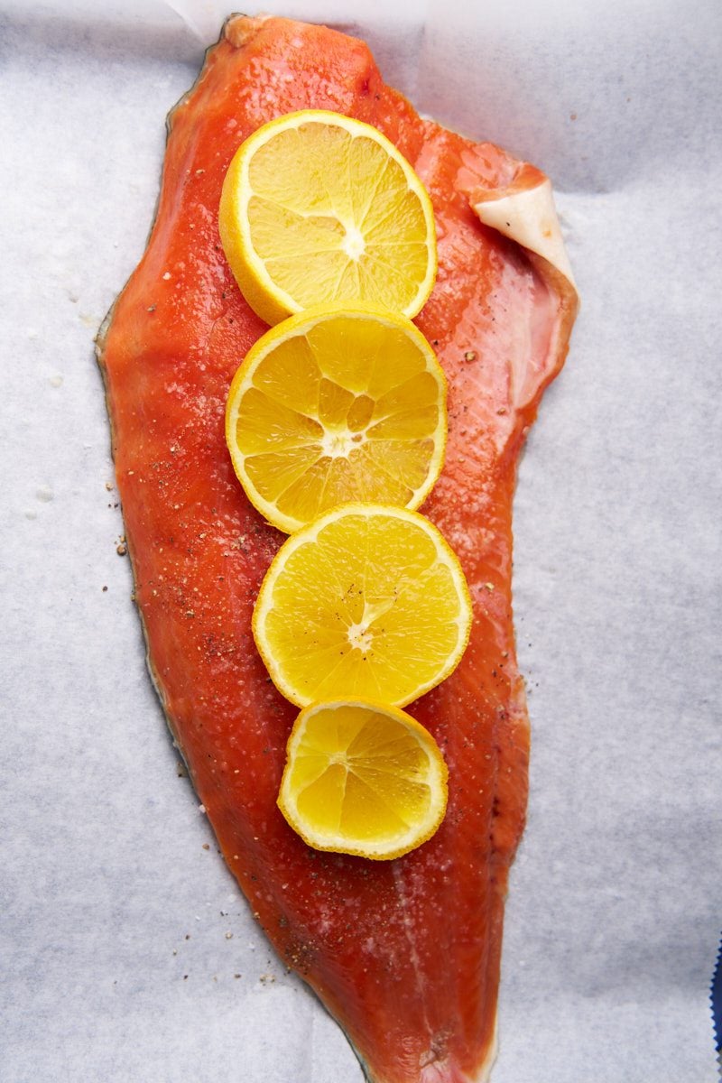 Squeeze half an orange on top of the salmon flesh and let it sit at room temperature for 5 minutes.