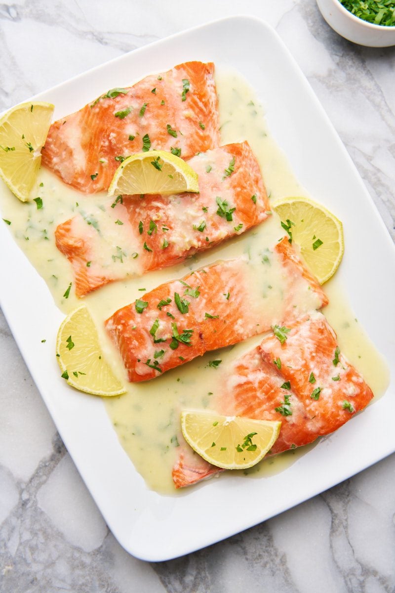 Place the salmon on a serving plate and drizzle with the warm butter sauce.