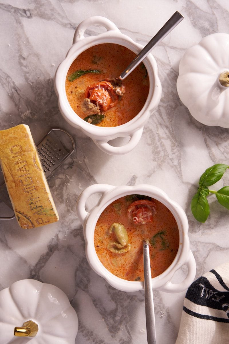 This soup features a creamy tomato broth with Italian sausage and cheese tortellini. It is hearty, flavorful and super easy to make.
