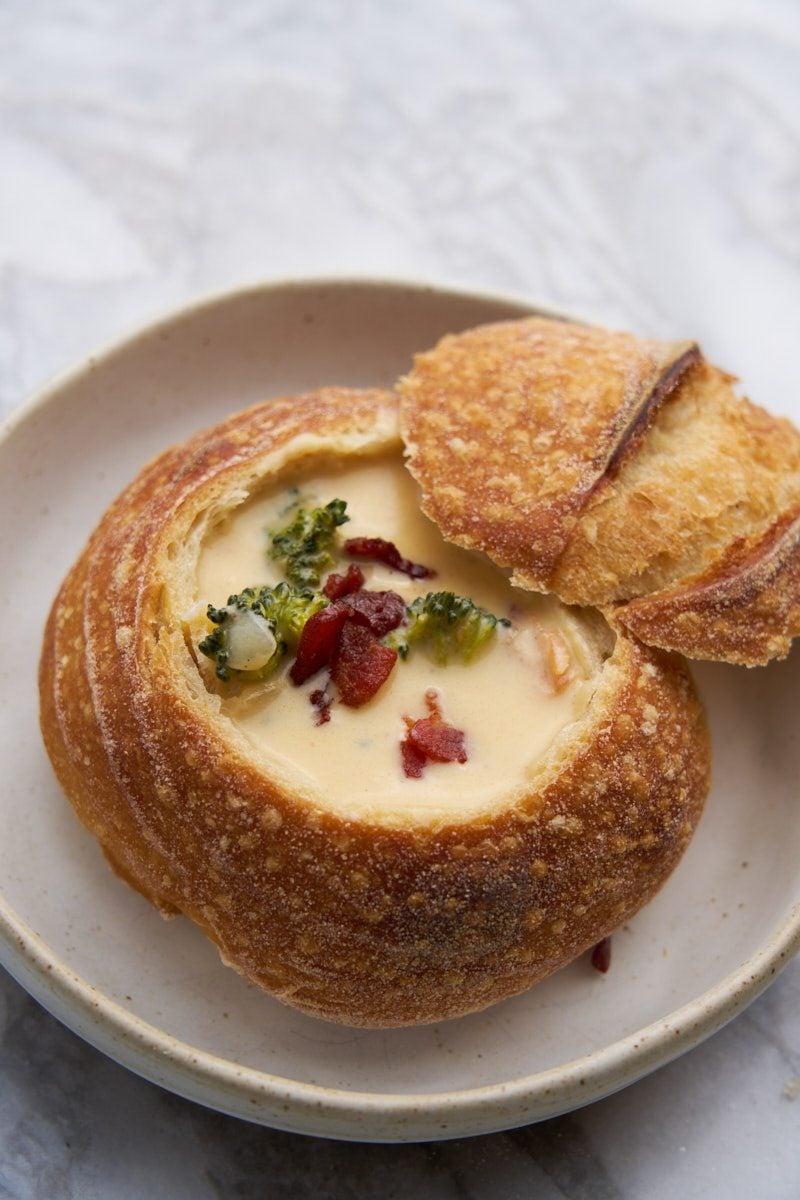 I baked some mini sourdough loaves and served it like a Panera copycat broccoli cheddar soup and it was amazing! Highly recommend serving this soup with some crusty bread.